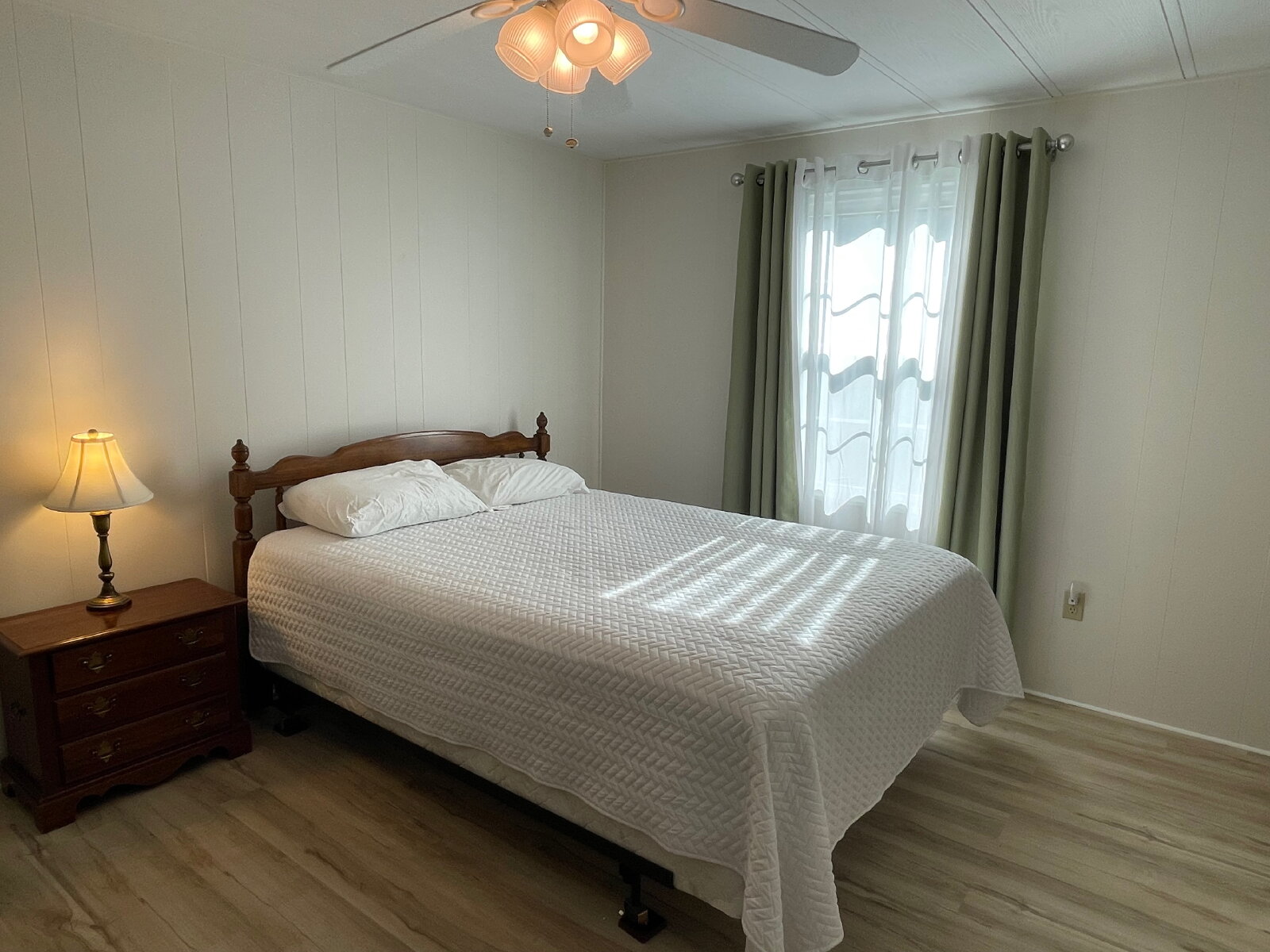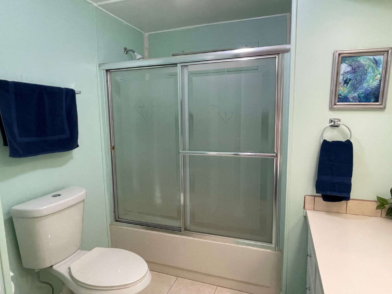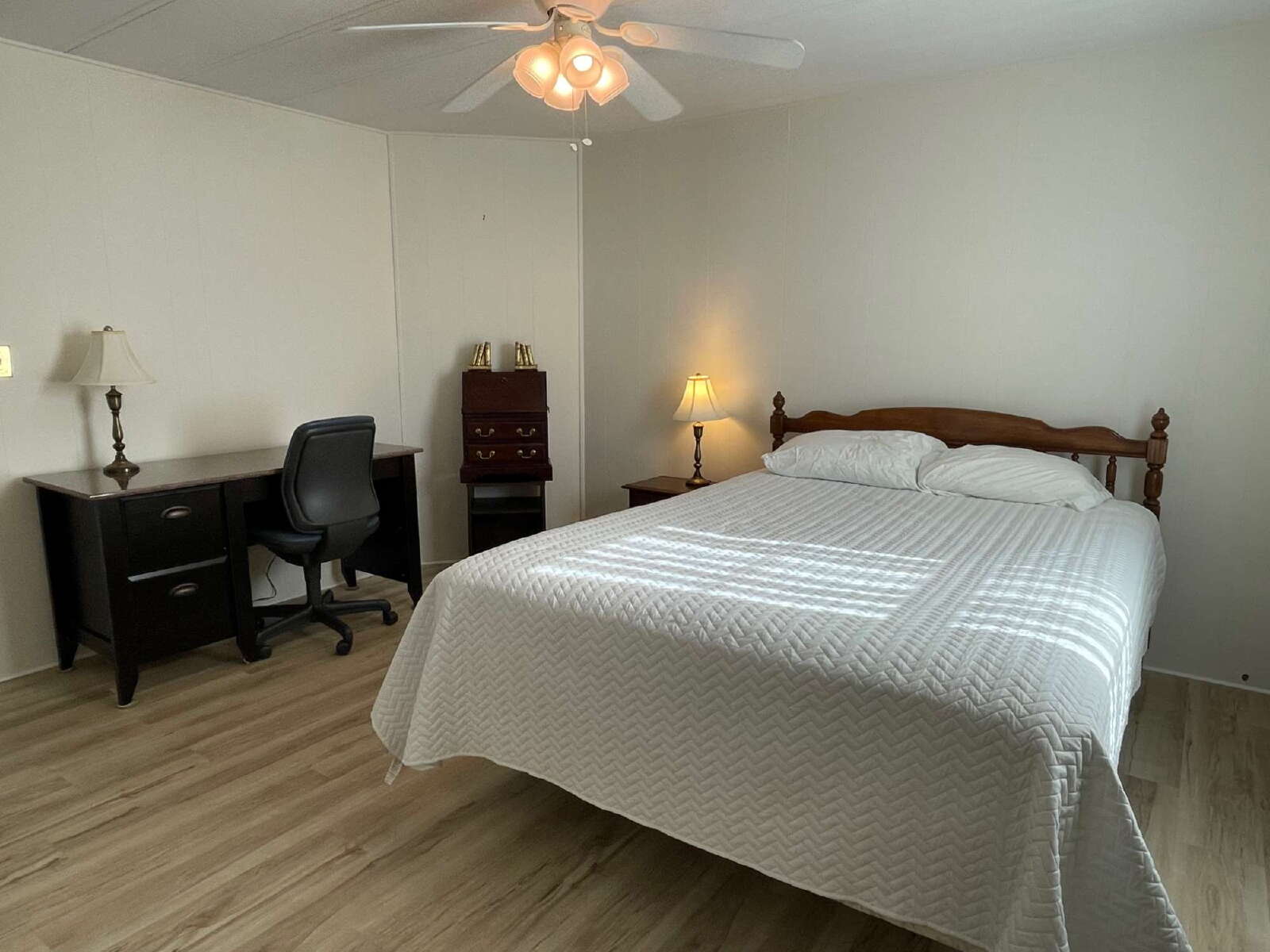 The guest bedroom is equally inviting, complete with laminate flooring and another walk-in closet, ensuring guests have all the comforts of home. The guest bath, finished in tile flooring, is conveniently located and tastefully designed for both function and style.